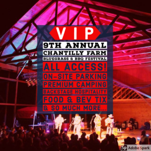 All access VIP ticket includes: 1 VIP parking pass within festival grounds, 2 nights Premium tent camping near all the excitement, (4) beverage garden tickets, (4) Chantilly Bucks to spend at food vendors ($20 value), Swag bag of awesome Chantilly merchandise, VIP only viewing areas, access to VIP hospitality tent, complimentary VIP-only happy hour, Backstage hospitality and closer access to performers…Come be part of the magic and get treated like bluegrass royalty!